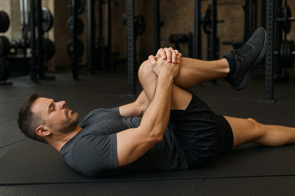 1. Przyciąganie kolana do klatki piersiowej (leżenie na plecach)
